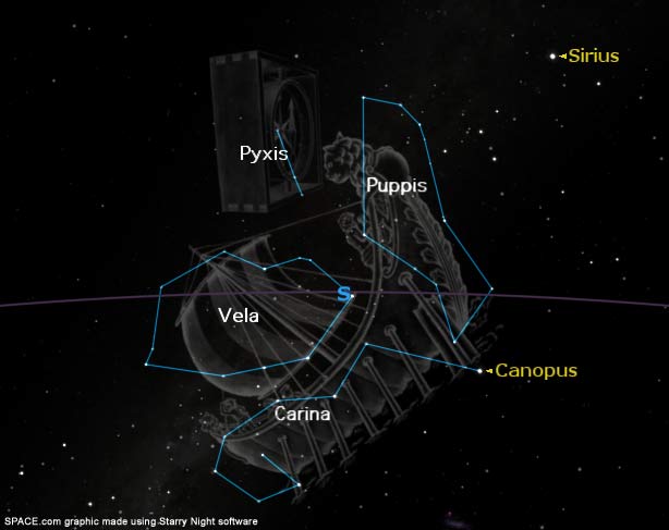 The three constellations making up the Argo are Puppis the stern, Vela the sails, and Carina the keel. When viewed from Sydney, Australia, the constellation is upside down, with Canopus topping the constellation set.