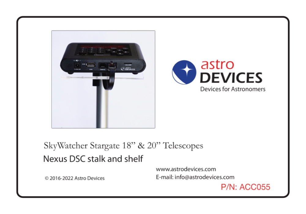 Need to mount your Nexus DSC to a StarGate telescope? This sturdy acrylic shelf makes it easy to keep your Nexus DSC & Nexus DSC Pro attached to the SkyWatcher StarGate.